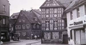 - Foto einiger der für den Bau des Stadtkernrings abgerissenen Häuser am Anfang der Erlanger Straße, darunter mittig Erlanger Straße 6 („Eck-Schoberth“)